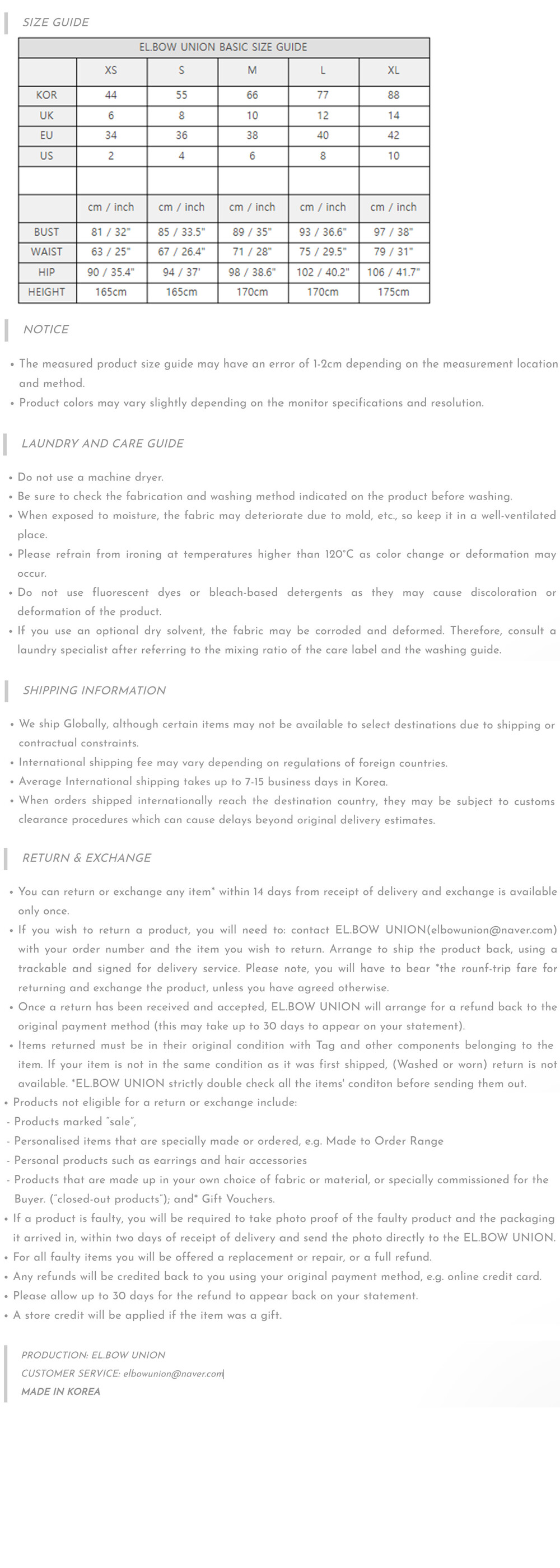 - Leave the measured sizes with your name on Q&A or email us(elbowunion@naver.com).